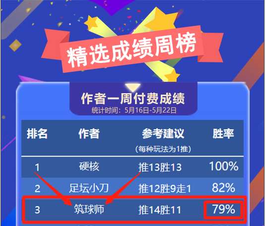 过往精选成绩周榜排名第三,精选参考14胜11 日期:5月16日~5月22日