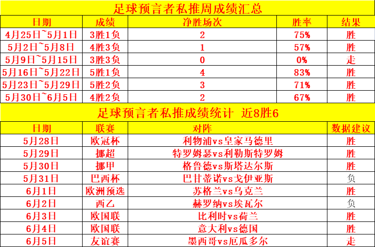 昨天为大家送上的公推、私推、精选一共3场比赛,取得2胜1走,恭喜有关注预言者的朋友;今天周一,回顾上周私推战况,取得6胜4,近8胜6,公推表现同样不俗,取得近8胜6的成绩。预言者已经连续6周都取得正向的表现,非常值得大家长期关注,也是实力的体现;不要因短暂的失误而终止关注,大家应该要有长期的计划,简单直接的方法就是开启包周业务,预言者必须会带领大家保持稳定的正向增长!