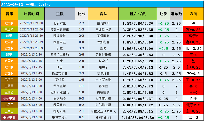 今天的比赛较多,笔者挑选了部分夜场比赛出来作为本期的参考,希望能够打出对应的高概率方向!