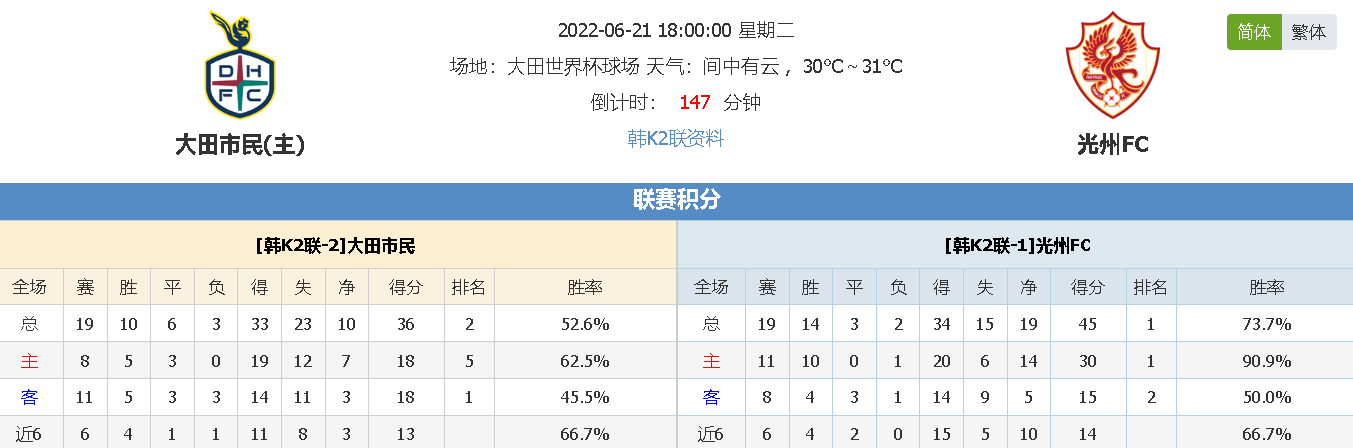 乐奇昨天晚场与大家分享了中超联赛长春亚泰vs河南嵩山龙门的比赛,本场比赛虽然有注意到长春亚泰门将刘伟国的表现,但是赛前长春亚泰主帅也注意到了这一点,吴亚珂临危受命首发出战,为球队守护住了大门安全,最终河南嵩山龙门90分钟无功而返,双方以0:0战个平手各取一分,关于两队赛前在动向方面的选择无法得到正确打出,目前累计成绩为24场比赛里获得16场的胜利,正向净值维持在了+8的位置,笔者本次的中期调整基本完成,为了争取迅速重返胜轨并创造更多连胜成绩,本日精选信心场次,务求斩获坚定的信心之选,为大家带来一场2022赛季韩K2联赛的比赛,大田市民vs光州FC,希望能通过本场比赛的分析再创佳绩,能得到各位的认可,和大家分享更多更好的见解,有望各位多多支持!
