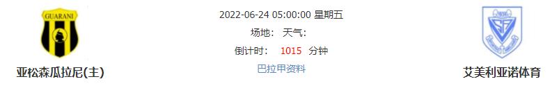 北京时间6月24日05:00,巴拉甲春季联赛第20轮比赛,亚松森瓜拉尼主场对战艾美利亚诺体育,亚松森瓜拉尼在首循环客场以1-0战胜了艾美利亚诺体育,本轮回到主场,亚松森瓜拉尼能否延续上一次交手的优秀表现再下一城?