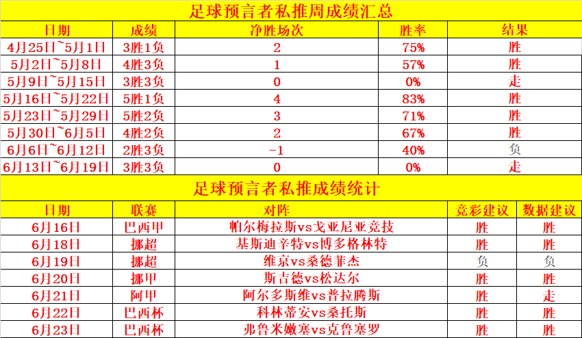 私推3连胜,近6胜5。近8周的成绩只有一周胜率低于50%,所以大家不要因短暂的失误而终止关注,大家应该要有长期的计划,简单直接的方法就是开启包周业务,笔者必须会带领大家保持稳定的正向增长!