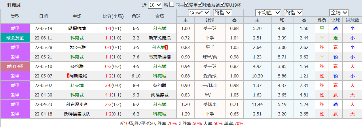 科克城在联赛本赛季排在第二,球队近期的发挥还是有减弱,4场比赛只拿到1场胜利,平局过多了,目前本赛季12胜4平1负,进攻防守能力强,科克城上场联赛赛事对阵朗福德城,对手的实力比一般,科克城半场取得领先,而下半场进攻相对保守,可惜到了最后时刻,被对手打平,最后时间过少,遗憾未能再次领先,1-1结束比赛。
