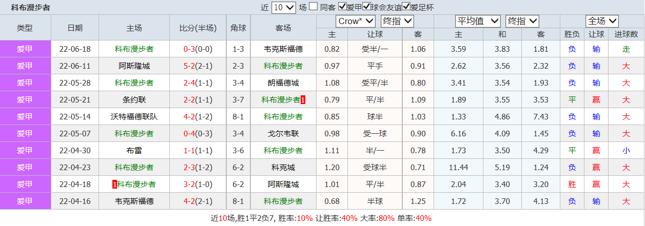 而科布漫步者是属于爱甲实力较差的球队,本赛季表现基本上防守极差,本赛季赛事取得2胜3平13负的成绩。科布漫步者上场面对韦斯克福德,球对虽然半场未丢球,不过下半场突然就全线溃败,防线接连失守,而且进攻线基本上找不到门框,场上完全处于劣势,下半场丢3球,0-3惨败对手。