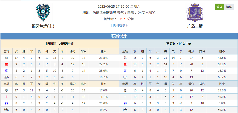 北京时间06月25日17:30,日职联第十八轮赛事福冈黄蜂vs广岛三箭,福冈黄蜂三连胜挺进升级附加区,保持优秀状态的他们能否继续乘胜追击?广岛三箭状态十分低迷,目前已濒临保级区的边缘,此番挑战是否已做好准备?