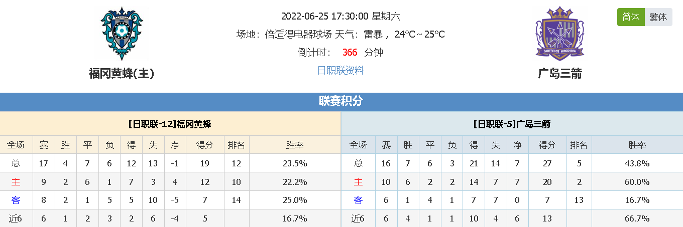 乐奇昨天与大家分享了中超联赛广州城vs长春亚泰的比赛,赛前预计广州城在此前负于长春亚泰之后可以有一定的经验,且得到对手让步之下值得考虑,而比赛中广州城虽然率先落后,但也曾一度将比分追至1球差距,可惜在下半场被对手扩大优势之后就再无表现,最终以1:3失去比赛,按照此前对于主队方向作出的支持无法正确打出, 目前累计成绩为25场比赛里获得16场的胜利,正向净值维持在了+7的位置, 为了争取迅速重返胜轨,本日精选信心场次,务求斩获坚定的信心之选,为大家带来一场日职联的赛事,福冈黄蜂vs广岛三箭,希望能通过本场比赛的分析再创佳绩,能得到各位的认可,和大家分享更多更好的见解,有望各位多多支持!