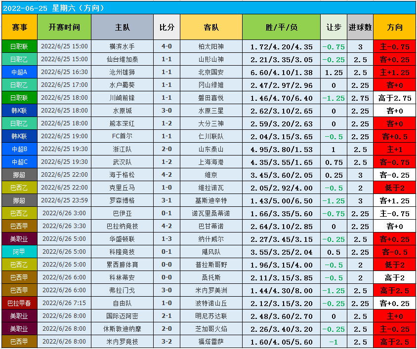 昨天数据表出色,早场的10场有8场顺利打出,晚场的5场有1场顺利打出,夜场的9场有7场顺利打出!昨天数据中,早场的表现出色,其中日职乙和中超的表现惊人,5场全部打出,尤其是中超,3场都完美打出对应的高概率方面,非常的给力!而韩职和日职联则是各自打出一般表现平稳!晚场的表现差强人意,其中挪超的表现较差,2场都未能打出对应的方向,而巴乙则是一胜一负表现平稳!夜场的表现出色,其中巴西数据表现不错,4场有3场顺利打出,而阿甲让步数据也完美拿下,非常的给力!当然最瞩目的还是美职业,3场都完美拿下数据,非常的出色!