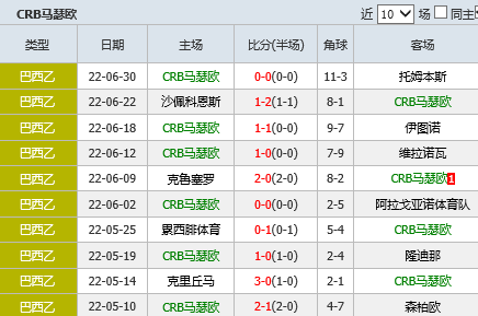 2、两队在之前的10次交锋中,CRB马瑟欧2胜3平5负处于下风,不过具体就主而言,近7次主场面对巴西瓜拉尼,CRB马瑟欧都能立于不败之地。
