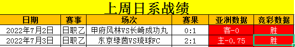 上期选择东京绿茵2:1琉球FC,主队方向成功拿下,北单也是成功跑出。最近20场比赛竞彩方面拿下14场,状态火热。上周2场日系比赛全部跑出,单周胜率100%,谢谢大家支持!东京绿茵虽然目前战绩不佳,但是面对实力较弱的琉球,拿下应该没有太大问题。值得关注的是上上周日系比赛分析错误时候,就是在东京和长崎身上吃了亏,上周又在他们身上找回2场。希望今天可以继续分析正确,给大家带去良好的比赛结果。