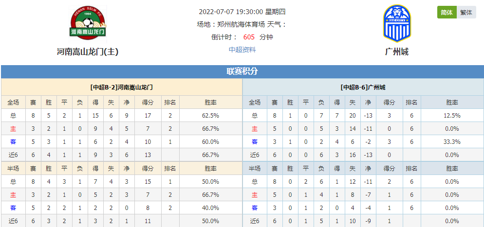 北京时间2022年07月07日19:30,此役是河南嵩山龙门与广州城本赛季的第二场对决,河南嵩山龙门新赛季表现超出预期,位居联赛前列,他们能否在本场乘胜追击。而广州城连败不止,不过来之不易的三分振奋人心,面对实力强劲的对手又有怎样的发挥?
