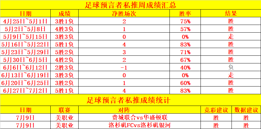 周初经历了近10周最低迷的时刻,还好笔者及时调整,昨天为大家送出了两场美职联,两场比赛都完美拿下;预言者者私推近10周里面,只有1周的胜率低于50%,其他都取得正向的表现,非常值得大家长期关注,也是实力的体现;不要因短暂的失误而终止关注,大家应该要有长期的计划,简单直接的方法就是开启包周业务,笔者必须会带领大家保持稳定的正向增长!