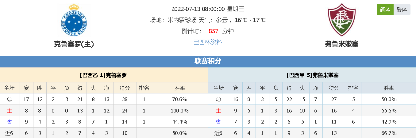 北单编号:13 克鲁塞罗vs弗卢米嫩塞