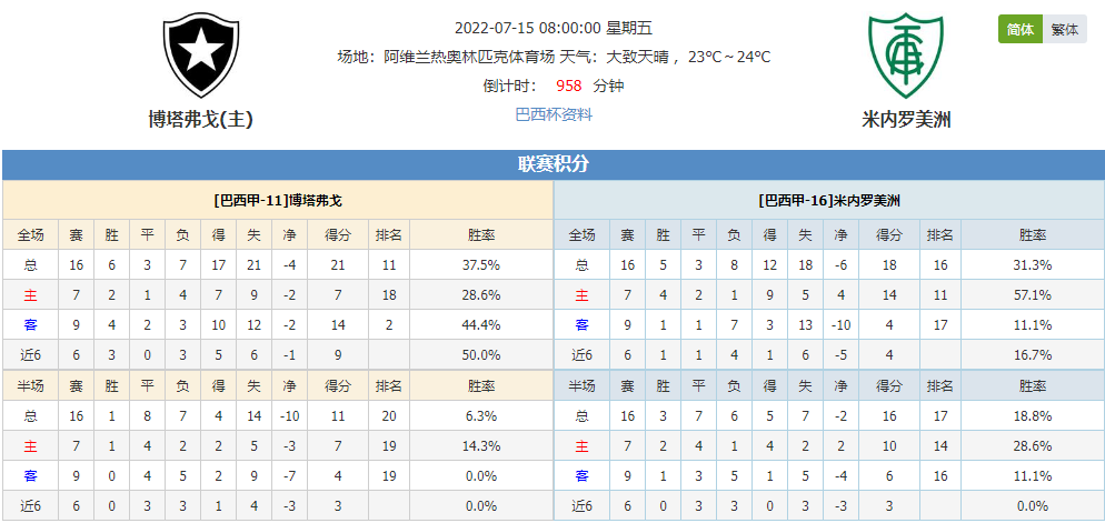 北京时间07月15日08:00,巴西杯第四圈次回合比赛,博塔弗戈vs米内罗美洲,两队近期联赛表现都平平无奇,今天巴西杯两队相遇谁能更胜一筹?