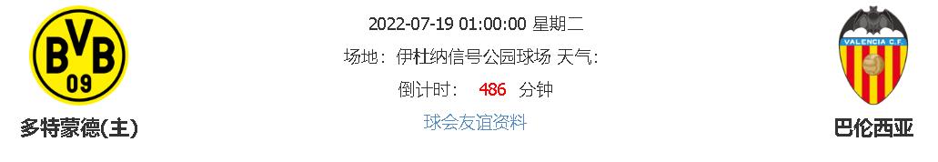北京时间7月19日01:00,球会友谊2022赛季七月赛程,德甲劲旅多特蒙德vs瓦伦西亚,蝙蝠军团在西甲联赛结束至今2个月未有过正式对赛,本次作客到伊杜纳信号公园球场能否凭借出色的表现获得主场观众的掌声?让我们一起关注!
