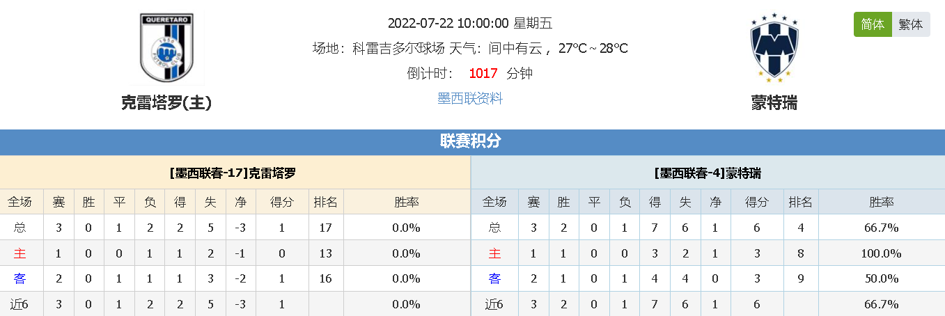 北京时间7月22日10:00,墨西联春季联赛2022-2023赛季,春秋连续两个赛季在联赛排名倒数的克雷塔罗状态未见好转,本场比赛坐镇主场之下面对近年墨西联具备冲冠实力的蒙特瑞能否争得一线生机?蒙特瑞上赛季虽然拿到了争冠附加比赛的资格,但是早早就止步在了附加赛的进度,本赛季能否重回巅峰争冠状态?让我们一起关注!