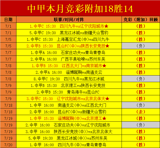 4.中甲的认知十分清晰,中甲新赛季开启后,本月取得中甲竞彩附加18胜14成绩,中甲在上赛季也曾取得竞彩附加9连胜,中甲的方向提示不容错失。