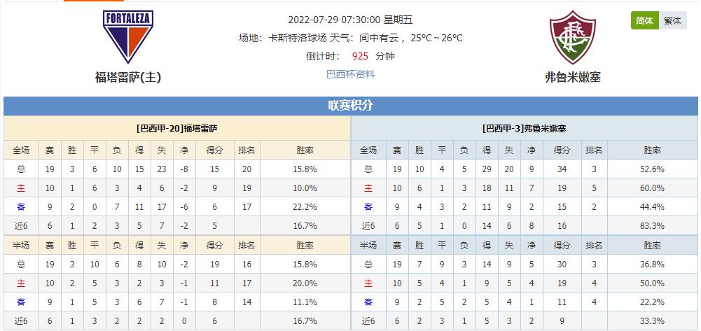 北京时间07月29日07:30,巴西杯半准决赛第一回合,福塔莱萨vs弗鲁米嫩塞。主队在联赛排名垫底,本赛季联赛仅仅取得3场胜利;而客队距离榜首位置差5分差距。今晚两队在巴西杯相遇,哪一队表现更佳?