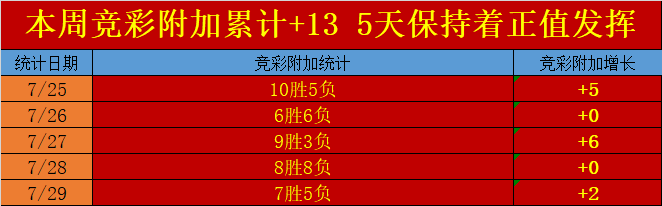 6.上月7月至今累计取得竞彩附加+497,突破竞彩附加+500触手可及,业内独领风骚的超长期统计,印证强劲实力;