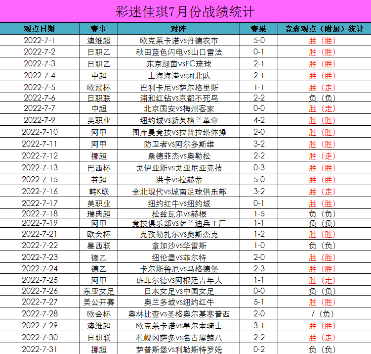 1.战绩统计: 7月11日-7月17日精选6场全胜战绩,胜率100%,荣获精选成绩周榜第一名。7月份已经过去,回顾7月份整体精选28场赛事,其中有7场失利,全月命中率75%。8月到来,预祝笔者开启新篇章,迎接本年度世界杯的到来。