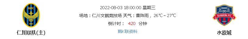 北京时间2022年8月3日18:00, 2022 南韩K联赛,仁川联队vs水原城,此役是韩K联赛第26轮的较量,主队仁川联队上轮联赛客场1-3不敌城南足球俱乐部,未能取得两连胜,此役坐镇主场仁川文鹤竞技场迎战水原城,两队如何对峙?下面由本作者为大家做详细阐述。