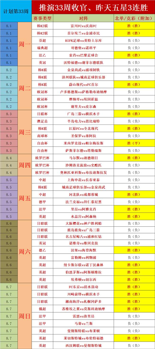 1、推演士计划第33周收官:昨天收官战,成绩尚可,拿下9胜5,其中五星建议3场全胜,还有日职联3场全胜,日职已经把前天失去的拿回来,上周整体表现稳定,本周整装待发。