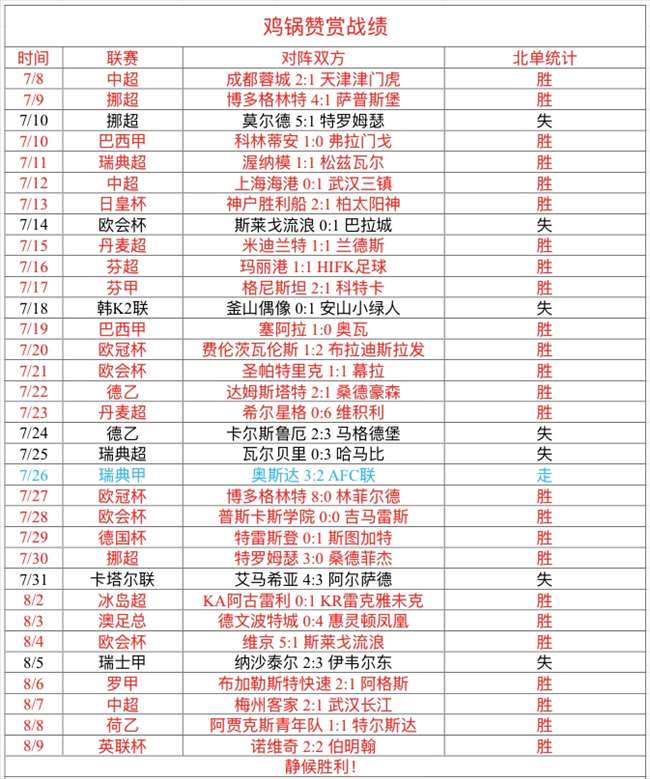 周二私推赞赏数据1场完美全胜拿下,很舒服!赞赏数据近32胜25,表现非常稳健!总进球数昨晚没有特别看好的比赛,没有发送!付费文章近11胜7!在此有个小说明,鸡锅无论当天有没有发送公推文章,赞赏私推都是正常发送的,如果鸡锅当天只发了付费文章,老铁们可以去鸡锅以往任何一篇公推文章下面赞赏即可获得当日赞赏私推!赞赏数据、赞赏总进球数和付费文章,这三条战线,鸡锅是齐头并进的,一起起飞!鸡锅私推会持续保持精挑细选原则,在精不在多,必须全胜起飞!