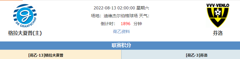 北京时间8月13日02:00, 2022-23赛季荷兰足球乙级联赛第2轮打响,格拉夫夏普主场迎战芬洛。格拉夫夏普本场主场面对上赛季荷乙降班马芬洛,能否迎来新赛季首胜,糖果将从多方面为您解读。