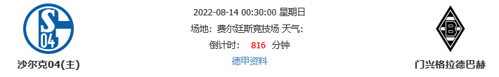 北京时间08月14日00点30分,22-23德甲联赛第2轮的一场比赛,门兴格拉德巴赫将前往费尔廷斯竞技场与沙尔克04展开较量。沙尔克04在首轮联赛中1-3不敌科隆,本轮面对劲旅门兴格拉德巴赫,其发挥更是不宜高估。
