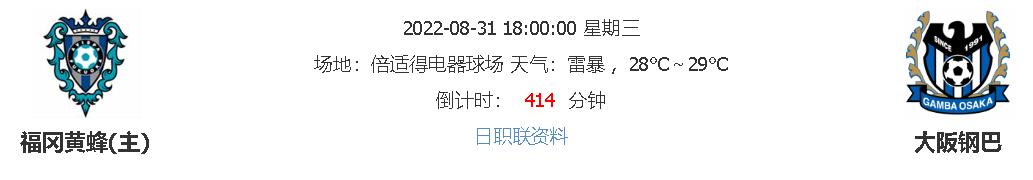 北京时间8月31日18:00,日职联2022赛季第24轮比赛,福冈黄蜂vs大阪钢巴,对战双方皆为保级而战,都急需抢分远离降级区,大阪钢巴上场终获胜利打破了7轮不胜的冰点局面,是球队的回光返照还是真正复苏?福冈黄蜂原地踏步多轮逐渐被身后队伍追上,此战在主场能否顺利拿下3分扩大保级优势?让我们一起期待!
