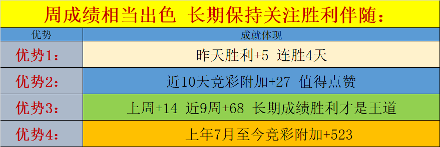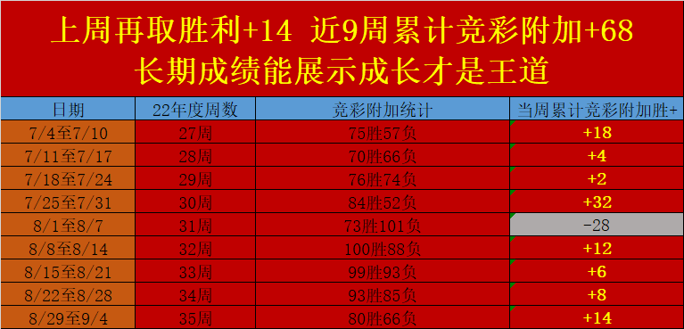 3.上周周成绩继续保持成长,上周累计竞彩附加+14,近9周累计竞彩附加+68,长期成绩能以增长展示才王道,才是值得保持支持的唯一理由;