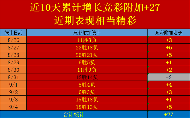 2.近10天累计竞彩附加+27成长,近期表现相当精彩,近期保持关注的朋友们定得到胜利的喜悦;