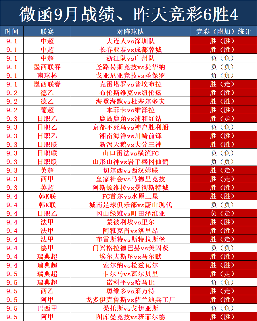 精彩分享:昨天不负老铁们的众望,再次打出了好成绩,竞彩6胜4,九月截止至昨天的成绩在继续增长,昨天虽然没有五大联赛,但发挥还是非常稳定,思路也十分清晰。