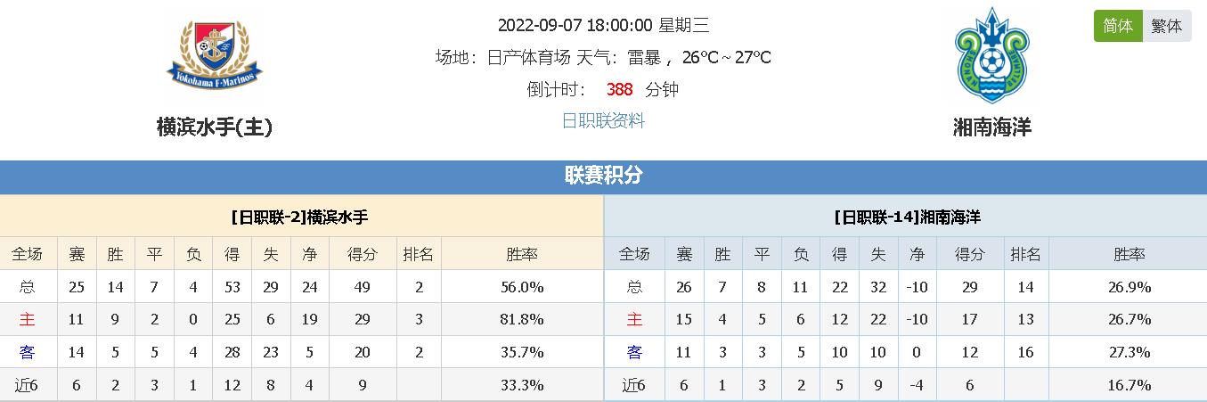 北京时间9月07日18时00分,日职联2022赛季第25轮补赛,横滨水手vs湘南海洋,本季表现强劲但刚刚失去榜首位置的横滨水手坐镇主场面对勉强摆脱降级位置却又回到保级边缘的湘南海洋挑战,此战会是一面倒的局面亦或是以弱胜强的剧情呢?我们拭目以待!