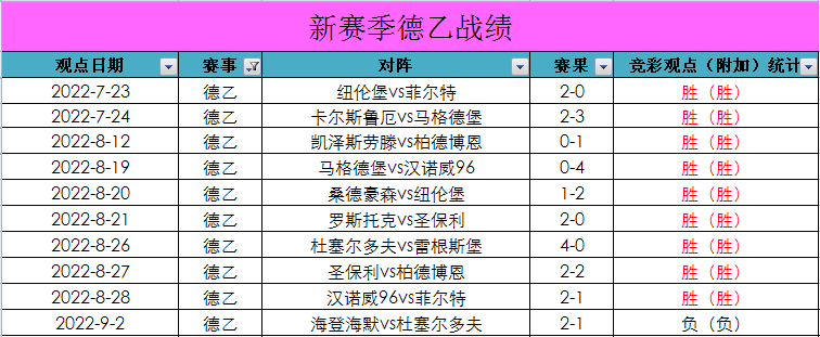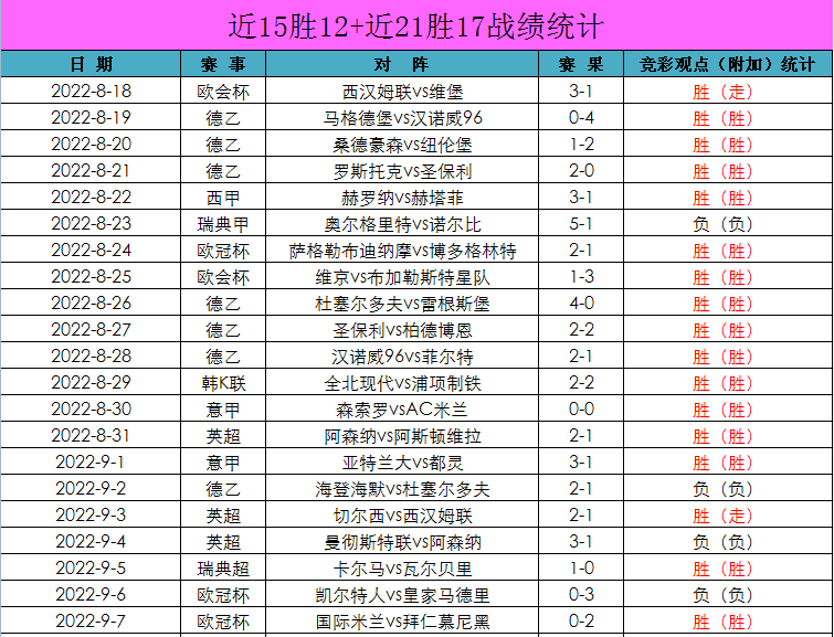3.昨日欧冠顺利打出,正所谓从哪里跌倒就从哪里站起来,拜仁慕尼黑2-0取胜。9月份首场旗开得胜,目前各项赛事15胜12,另外近21场竞彩取得17场胜利,值得一提的是德乙新赛季10胜9。9月到来,预祝笔者开启新篇章,迎接本年度世界杯的到来。