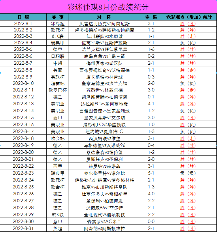2.战绩统计:8月22日-8月28日再次荣获精选周榜第一名,回顾8月份精选31场赛事,其中竞彩取胜26场,8月全月命中率高达84%。