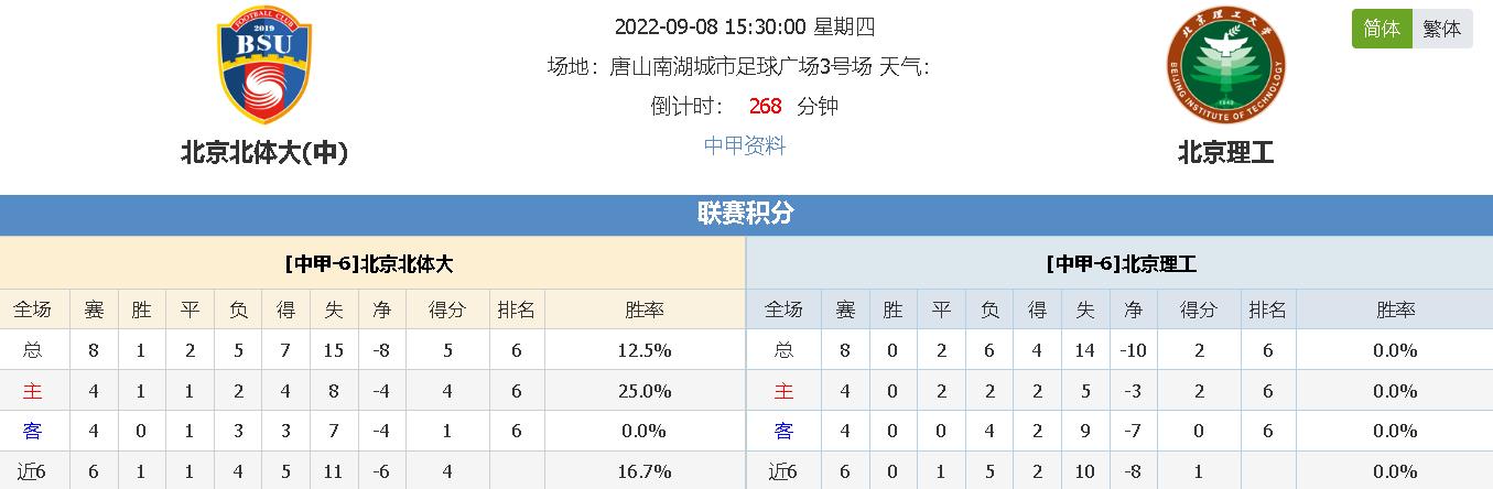 北京时间9月08日15时30分,中甲联赛2022赛季第三阶段A组第三轮比赛,北京北体大vs北京理工,双方在进入第三阶段后均未取得胜利,状态和士气都处于低位,急需胜利扭转局面之下两支来自北京的大学生队伍谁能抢下本场三分?让我们拭目以待!