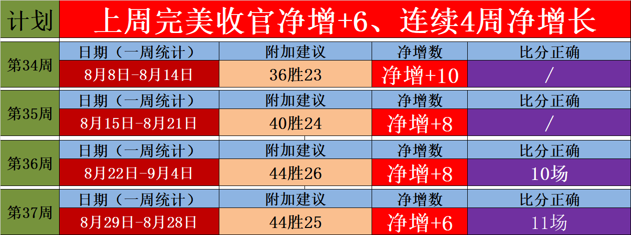 不要因短暂的一两天成绩下滑就因此放弃,成绩恢复后又再进行关注和选择,这样会导致计划中断,因为足球竞彩不可能一场或者一夜就能解放,一周或者一个月保持着的增长,才是永远的胜利者,所以提醒大家不要选择性的关注,推演是追求长期的,只要按照推演士每周的计划进行,必定是有所增长的,每周保持稳定,才是理性长期的发展。