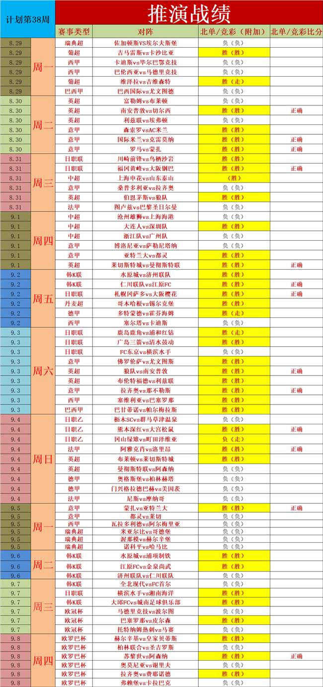 1、推演士计划第38周(走不纳入统计),昨天6场欧罗巴杯6胜3,保持稳定,近期都是杯赛为主,一些基本面的信息误导性的比较多,推演也是凭借多年的经验,从整体思路来看,是稳定增长的。