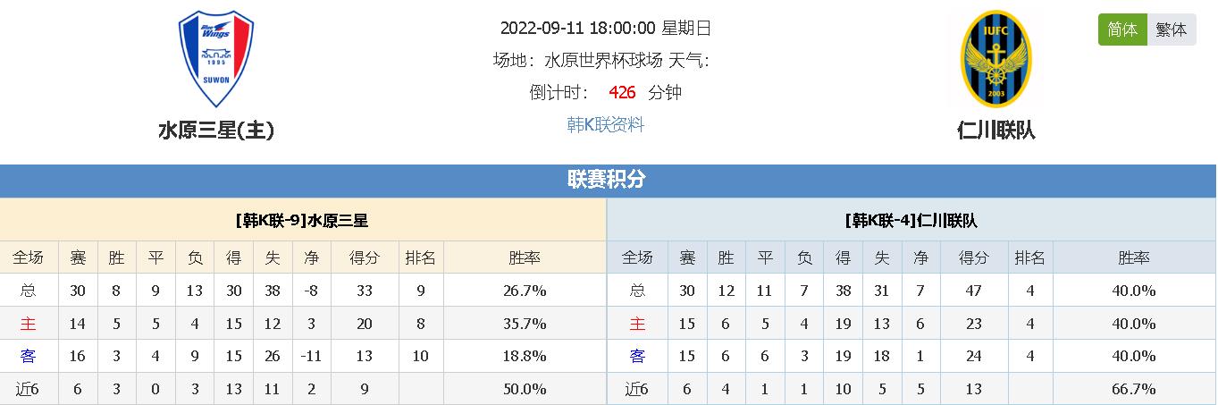 北京时间9月11日18:00,韩K联赛2022赛季第31轮比赛,水原三星vs仁川联,韩K联赛常规赛程只剩3轮,本场作客的仁川联排名联赛第4距离第3名仅差1分,此战面对同样急需积分为实现保级提前作出准备的主队水原三星,仁川联队能否顺利全身而退?让我们拭目以待!