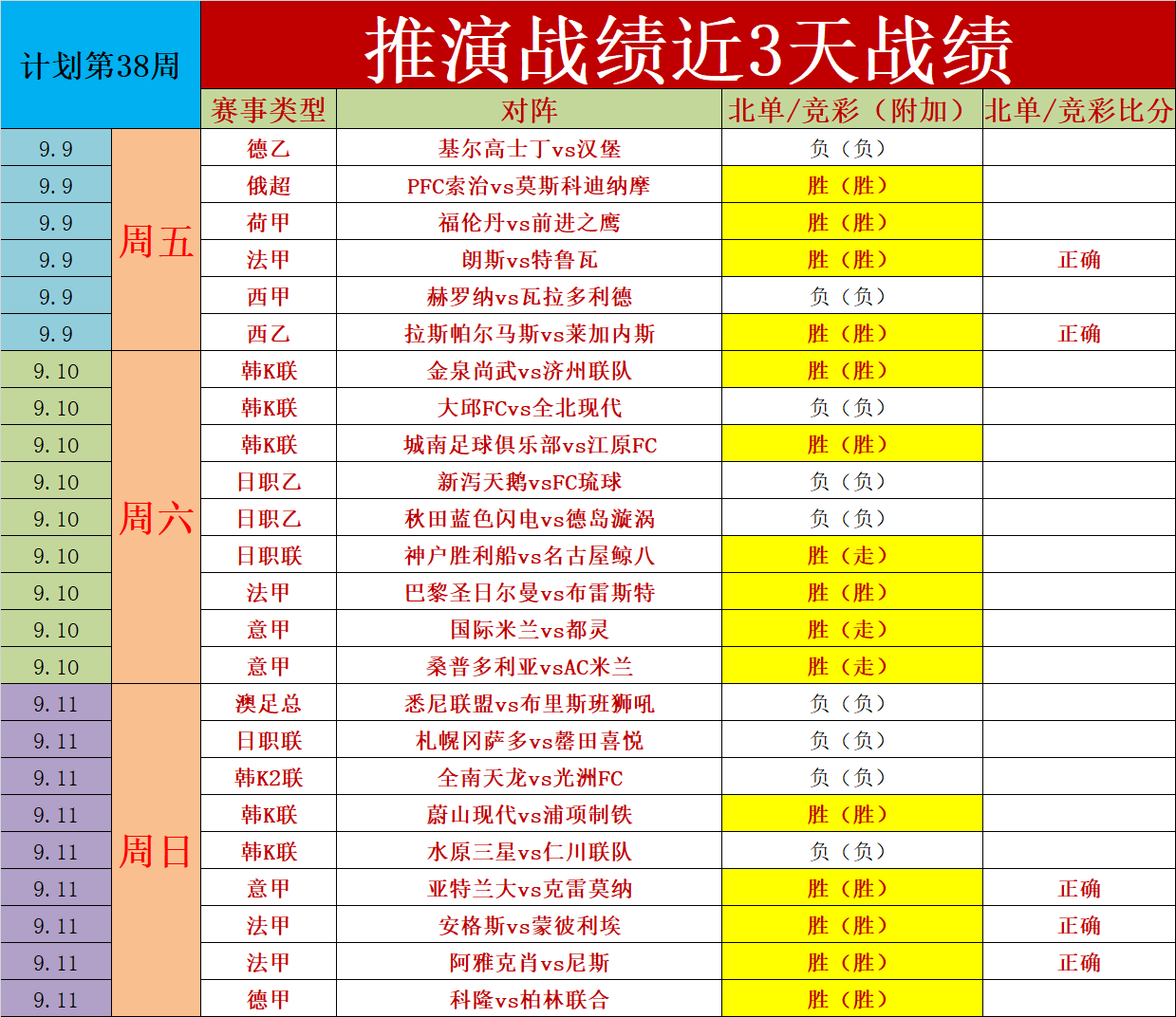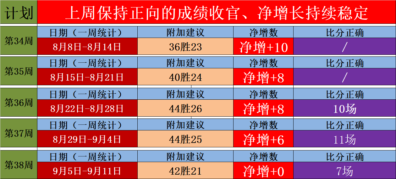 1、推演士计划第39周(走不纳入统计),昨天上周保持正向的成绩收官,整体建议没有出现负增长,并且有7场比分预测正确,昨天保持净增长,9胜5,在早场失利后,晚场的五大联赛迅速夺回胜利,昨天4场五大联赛大获全胜,五大联赛就是推演的重中之重,今天是计划第39周的开始。