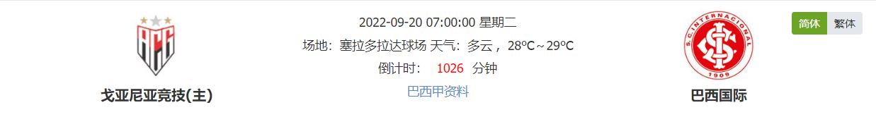 北京时间2022年9月20日07时00分,巴西甲第27轮的对决,保级区的戈亚尼亚竞技主场迎战争冠区的巴西国际,戈亚尼亚保级形势不容乐观,此番面对强队,还有机会吗?