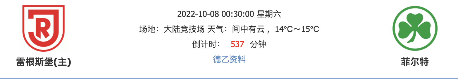 雷根斯堡以3胜2平5负,积分11,排名联赛第12;菲尔特以1胜5平4负,积分8,排名联赛第17