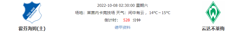 北京时间10月8日的凌晨02点30分,德甲联赛的第9轮赛事的全新一圈即将率先展开激烈的角逐!——由“升班马”云达不莱梅将会作客去到莱茵内卡竞技场挑战老牌劲旅霍芬海姆!重返德甲后的不莱梅能否延续不败的客场战绩在今仗全身而退?还是本赛季至今主场表现出众的霍村能够保持状态击退对手?下面将由Yoyo姐将为大家带来详细的赛事分析: