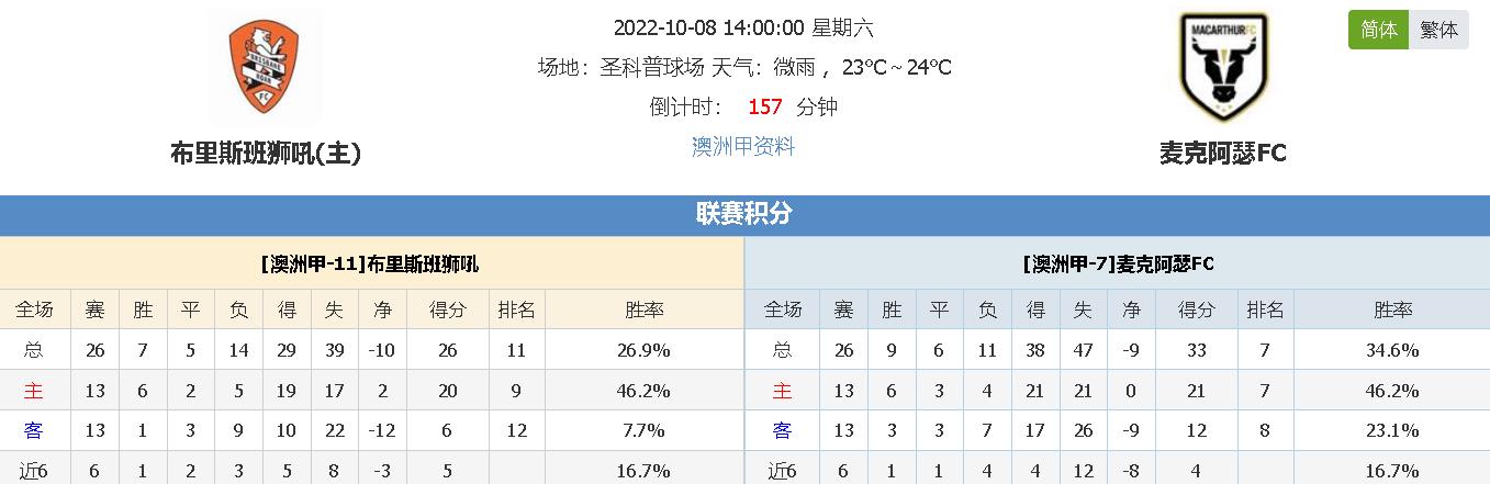 北京时间10月08日14:00,澳洲甲2022-2023赛季新赛季首轮比赛,布里斯班狮吼vs麦克阿瑟FC,主队上赛季持续走弱排名联赛倒数与季后赛无缘,本赛季首战能否重振旗鼓打响头炮?麦克阿瑟FC建队年限不长,但亦表现出黑马潜质,首轮比赛能否在客场凯旋而归呢?让我们拭目以待!