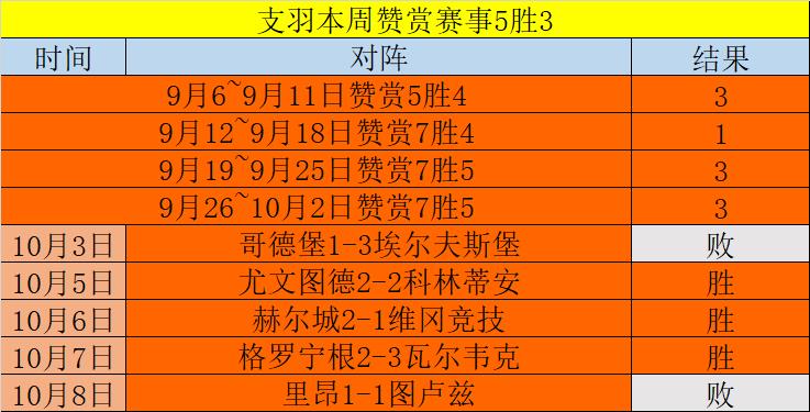 昨天赞赏赛事2胜1,有些遗憾里昂没有给我们带来惊喜,本周支羽赞赏赛事5胜3,连续4周保持正数据。状态依然在线,今晚继续加油!