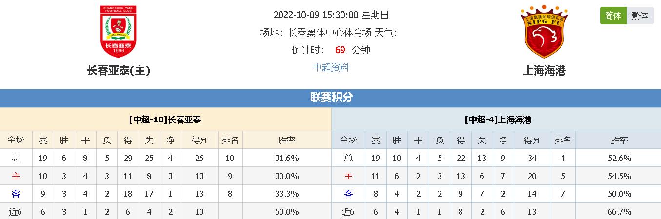 北京时间10月09日15:30,中超2022赛季第二十二轮比赛,长春亚泰vs上海海港,联赛进入下半季,主队暂列中游行列比上不足比下有余,本场战意如何还待商榷,客队通过夏季引援球队实力大增,接下来的下半赛季为了冲入亚冠区而战,全取三分的欲望不可谓不强烈,本场赛果如何走向?让我们一起关注!