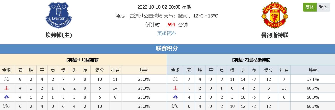 北京时间10月10日02时00分,英超联赛2022-2023赛季第10轮比赛,埃弗顿主场迎战曼彻斯特联,双方在开季初期均遭遇连败,通过及时的调整近期状态同时有所提升,本场谁能延续不错走势?让我们拭目以待!