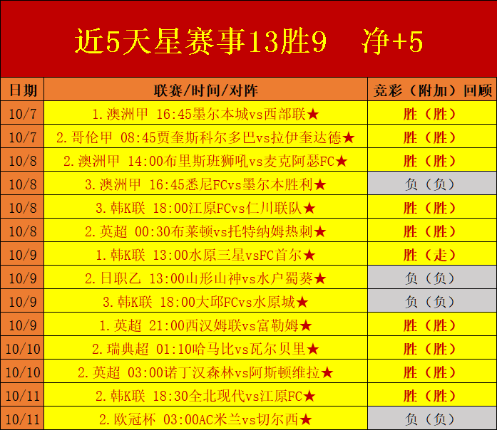 4.作为整体信心支撑的星赛事已经持续5天迎来净增,达到13胜9的高幅收获。