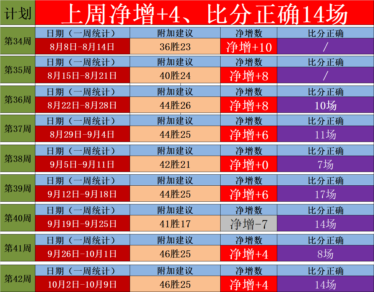 2、上周净增+4,近9周有8周净增长,9周净增+39场,上周预测14场比分正确,持续的保持了高效的稳定。