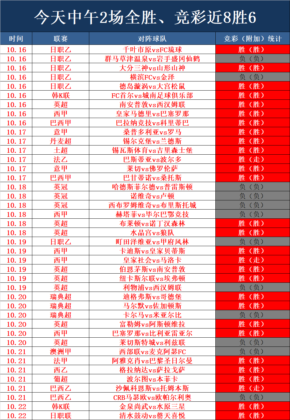 精彩分享:昨天又一次打出了漂亮的战绩,昨天竞彩6胜4,已经连续3天狂胜了,状态正盛,依然处于巅峰的状态,今天周末,今天中午的韩K和日职联2场大获全胜,首开纪录,先拿下2场胜利,加上昨天的合计竞彩8胜6,周末欧洲主流联赛继续,我们乘胜追击。